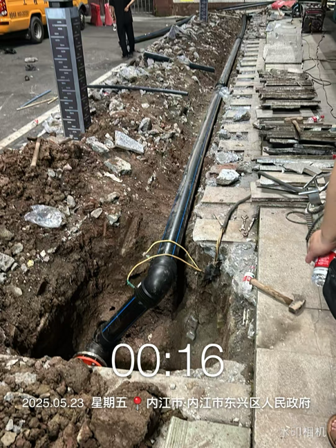 搶修現(xiàn)場,維修人員面對夜間視線不佳、高溫作業(yè)、現(xiàn)場環(huán)境復(fù)雜等多重挑戰(zhàn),爭分奪秒、迎難而上,通宵達(dá)旦開展搶修工作。次日凌晨3點(diǎn)58分,維修人員熊弈在工作群里發(fā)布消息:“東興區(qū)政府DN150鋼管因漏點(diǎn)在建筑下方無法維修,已從旁改管繞過漏點(diǎn),160PE管改管約60米,63PE管改30米,加裝50銅閘閥一只,現(xiàn)已修復(fù)通水?!敝链?,搶修工作圓滿結(jié)束,恢復(fù)正常供水。