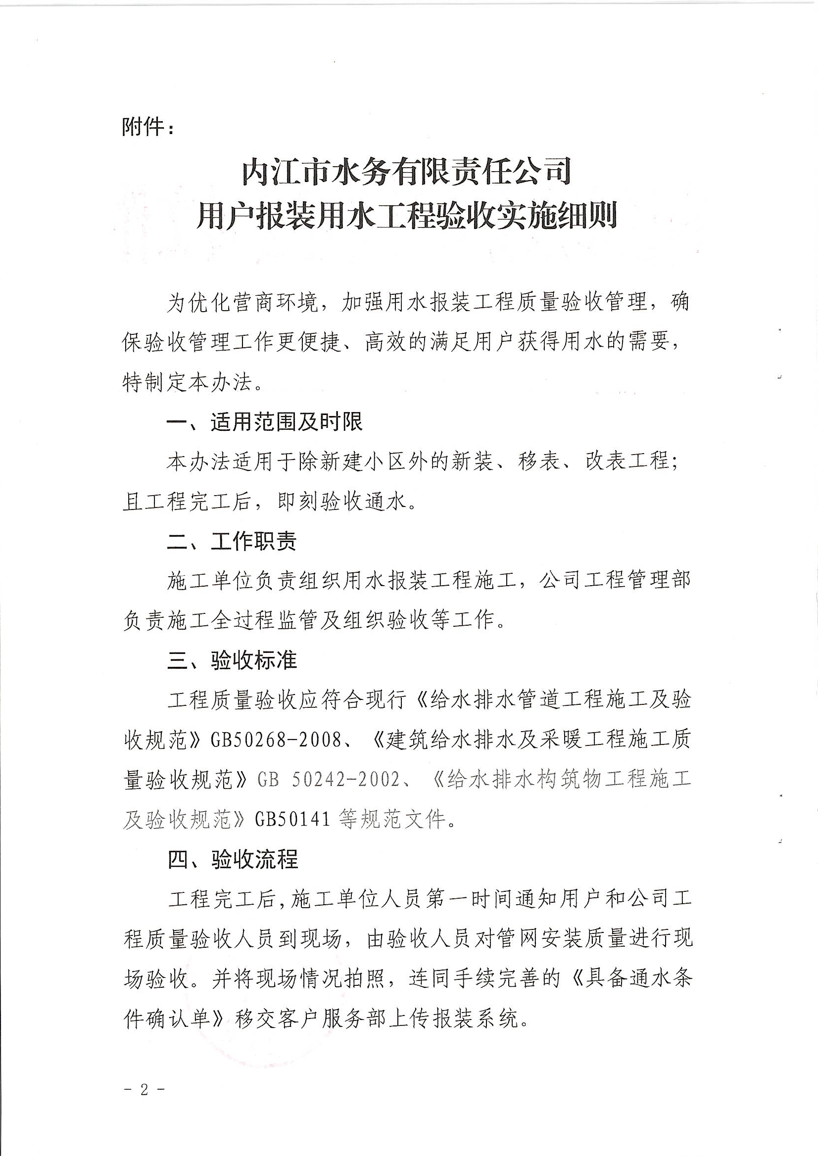 內(nèi)江市水務(wù)有限責(zé)任公司用戶報裝用水工程驗收實施細則
